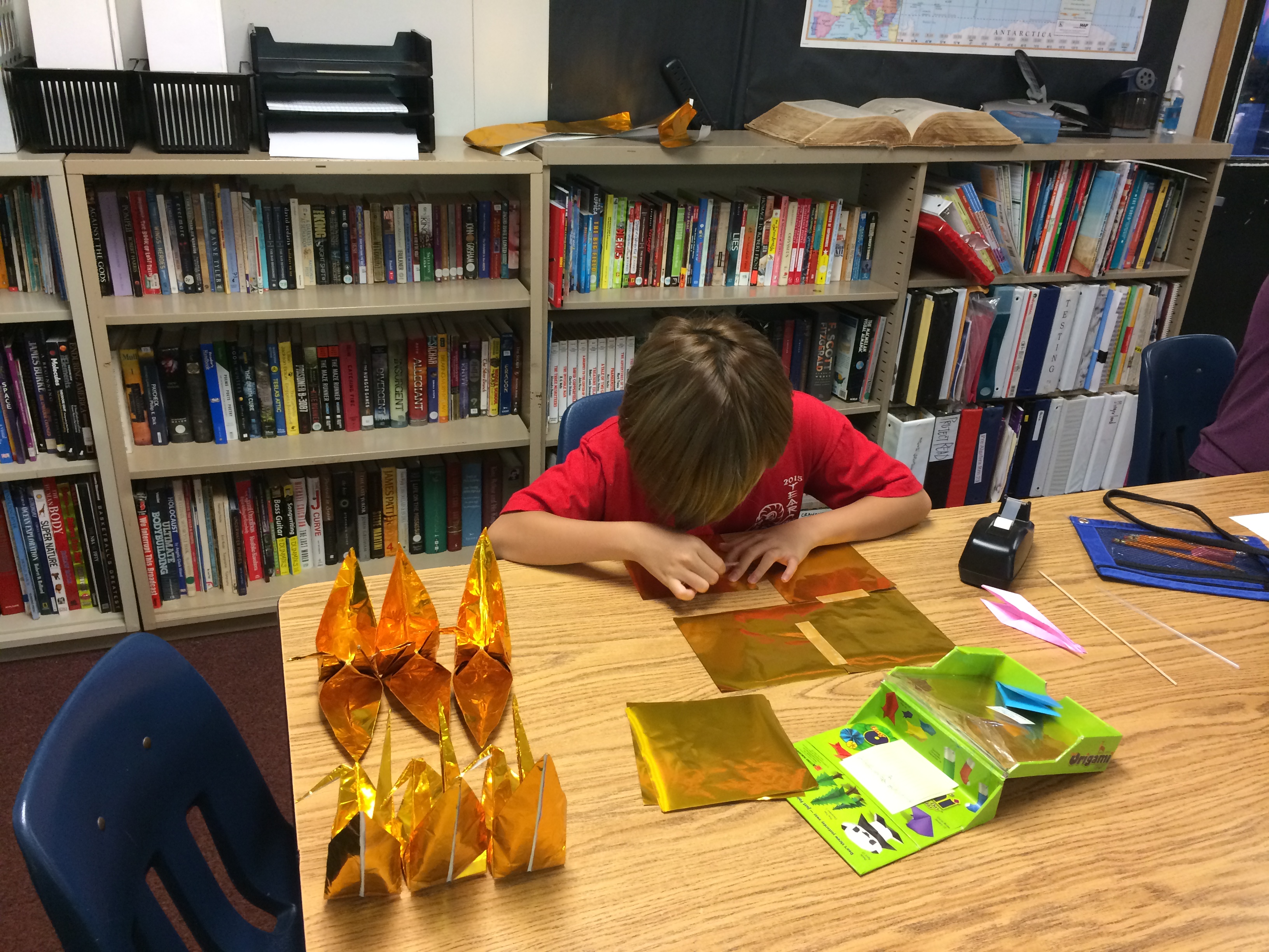 You may be wondering, “Why 1,000 cranes?” According to Japanese legend, folding a paper crane and making a wish ensures your wish will come true. Our class read the story of Sadako, a young Japanese girl who became very sick after World War II. She decided to make 1,000 paper cranes and wish for good health. Sadly, she never made it to 1,000. After she passed, her classmates finished making the rest in her honor. Since then, Sadako’s 1,000 cranes have become a symbol of world peace.