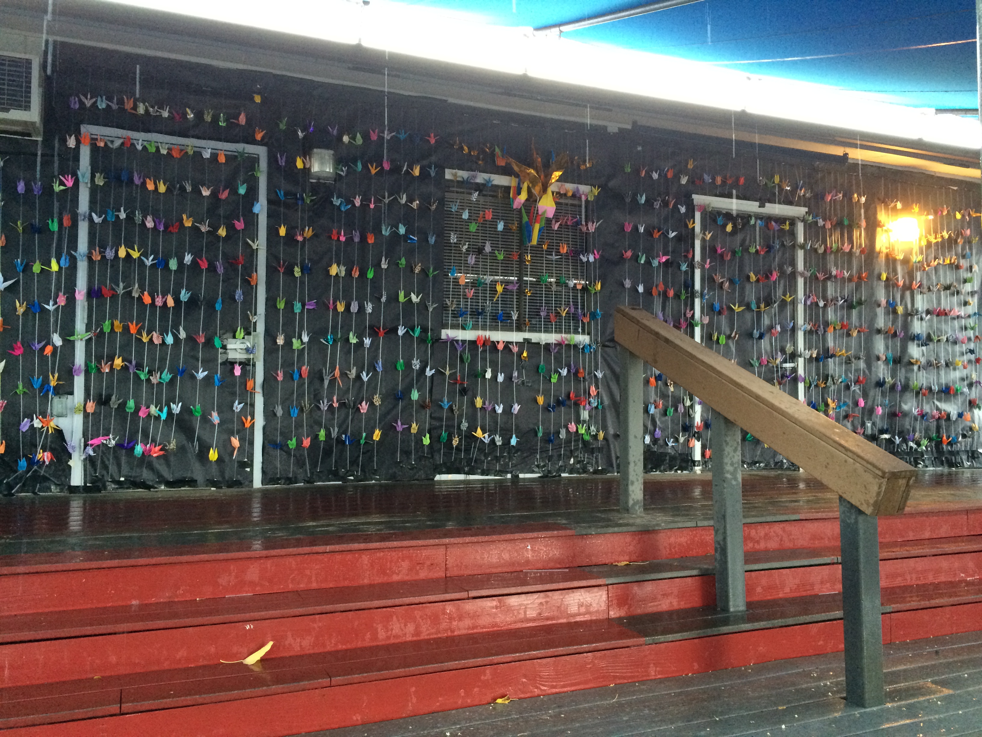 Class 65 had been folding origami cranes for days, and spent hours installing their art on our assembly stage. In addition to their 1,000 cranes, the student made special golden cranes as gifts of peace, goodwill and community. These golden cranes were presented to a representative of each classroom at assembly. The wings of these cranes were left straight so each class could decide how to display them.